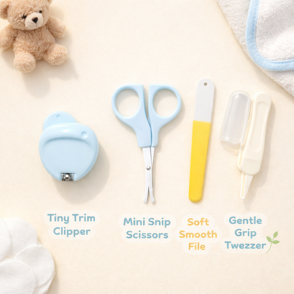 Complete baby grooming kit with nail clipper, scissors, file, and tweezer—safely designed for gentle care of your baby’s delicate nails